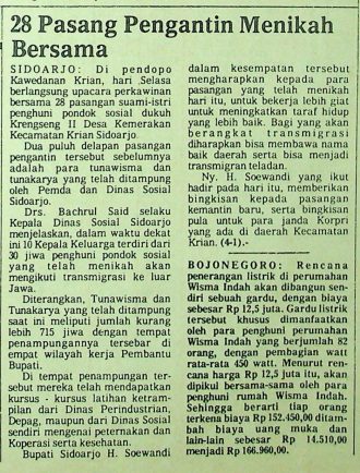 Di pendopo kawedanan Krian, berlangsung upacara perkawinanan bersama yang diikuti 28 pasangan suami-istri penghuni pondok sosial dukuh Krengseng II Desa Kemerakan Kecamatan Krian Sidoarjo.