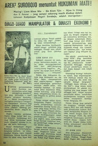 Untuk pertama kalinya arek2 Suroboyo menyampaikan salut yang setinggi-tingginya kepada pihak berwajib terutama kejaksaan dalam ketangkasannya meringkus 4 benggolan (Liem Khoe Nio – Go Kiem Tjin – Njoo Le Hong) manipulator ekonomi sekaligus yang secara langsung telah mendirikan dinasti di bidang perekonomian yang hanya dituntut hukuman pidana sedangkan masyarakat menginginkan hukuman mati.