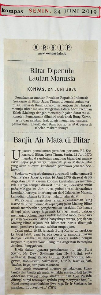Pemakaman mantan Presiden RI Soekarno di Blitar, Jawa Timur, dipenuhi lautan manusia. Pemakaman dihadiri anak-anak Bung Karno, istri, dan sahabat.