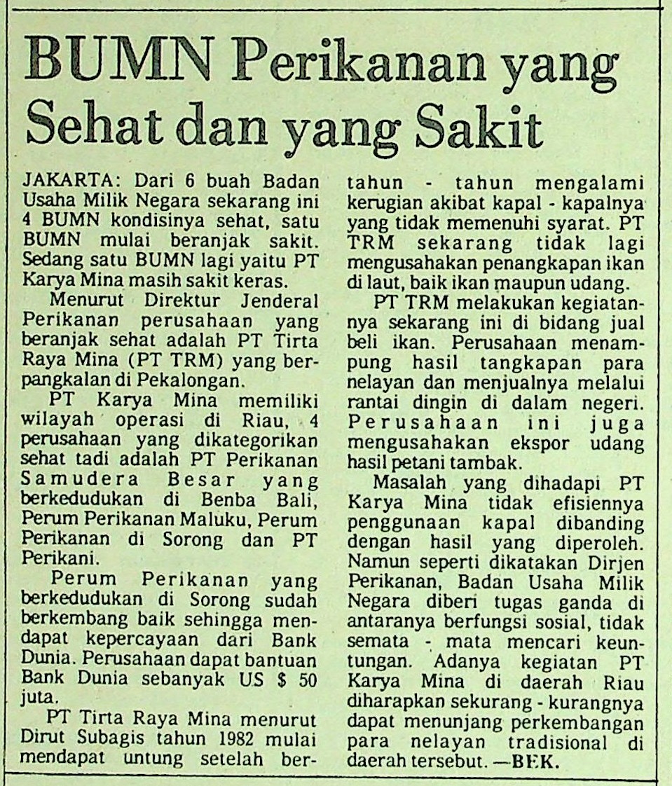 Dari enam buah BUMN, empat di antaranya dalam kondisi sehat, satu BUMN mulai beranjak sakit, sedangkan satu BUMN lagi yaitu PT Karya Mina masih sakit keras. Menurut Direktur Jendral Perikanan, perusahaan yang beranjak sehat adalah PT Tirta Raya Mina (PT TRM) yang berpangkalan di Pekalongan.