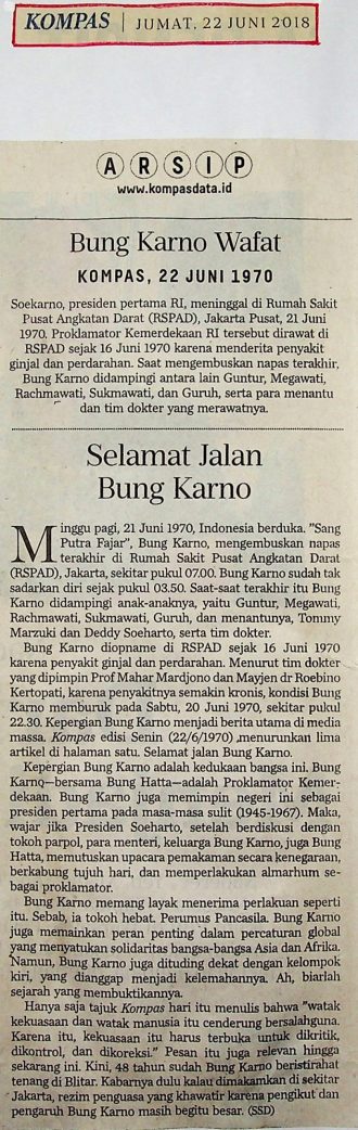 Soekarno, meninggal di Rumah Sakit Pusat Angkatan Darat (RSPAD), Jakarta Pusat, 21 Juni 1970.
