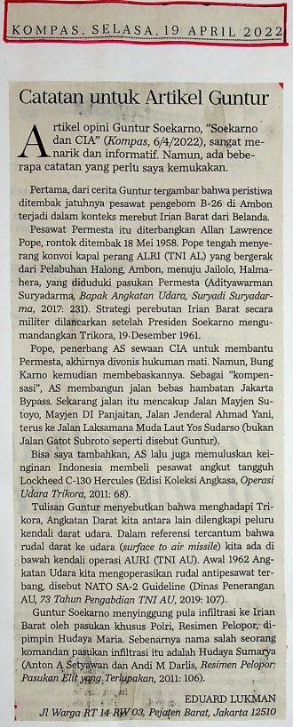 Artikel opini Guntur Soekarno, “Soekarno dan CIA” (Kompas, 6/4/2022), sangat menarik dan informatif. Namun, ada beberapa catatan yang perlu dikemukakan oleh penulis ini.
