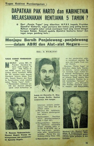 Dari 5 tugas yang diberikan MPRS kepada Presiden Soeharto dalam rencana kepemimpinannya selama 5 tahun, tugas pertama dan kedua merupakan yang paling berat. Bahkan mungkin susah untuk mencapai hasil yang sesuai dengan harapan rakyat kecuali apabila Jenderal Soeharto benar-benar tegas tanpa pandang bulu. Tugas tersebut adalah menyapu bersih penyeleweng dalam badan ABRI dan alat-alat negara lainnya.