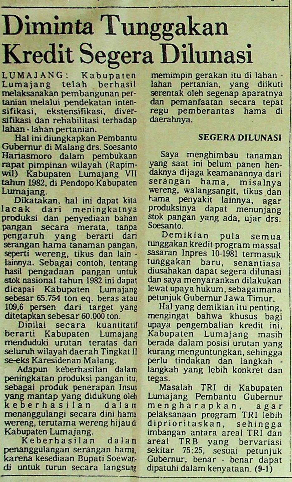 Drs. Soesanto selaku pembantu Gubernur menyampaikan bahwa semua tunggakan kredit program massal sasaran inpres 10-1981 di Lumajang diusahakan dapat segera dilunasi lewat upaya hukum.