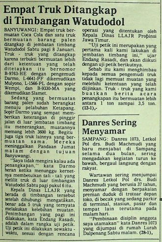 Empat truk bermuatan Coca Cola dan satu truk bermuatan barang palen ditangkap di jembatan timbang Watudodol Sabtu 8 Januari 1983, truk-truk yang ditangkap karena terpukti bermuatan lebih dari ketentuan yang telah ditetapkan