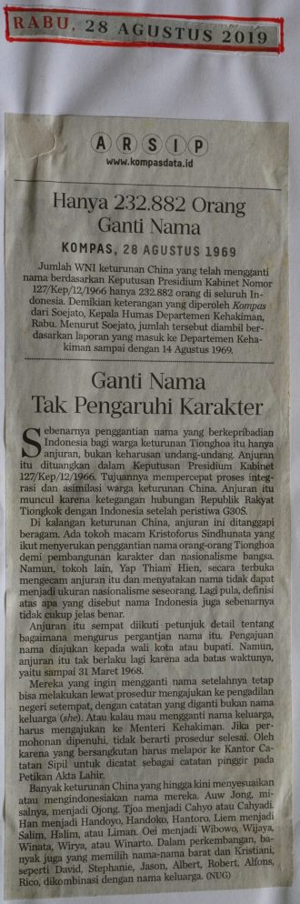 Berdasarkan laporan Departemen Kehakiman, hingga tanggal 14 Agustus 1969, jumlah WNI keturunan China yang telah mengganti nama berdasarkan Keputusan Presidium Kabinet Nomor 127/Kep/12/1966 berjumlah 232.882 orang di seluruh Indonesia. Tujuan peraturan ini adalah untuk mempercepat proses integrasi dan asimilasi warga keturunan China. Ajuran ini muncul karena terjadi ketegangan hubungan RRT dengan Indonesia setelah peristiwa G30S.