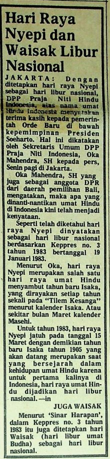 Dengan ditetapkan Hari Raya Nyepi sebagai hari libur nasional, DPP Praja Niti Hindu Indonesia, atas nama umat Hindu Indonesia menyatakan terima kasih kepada pemerintah Orde Baru