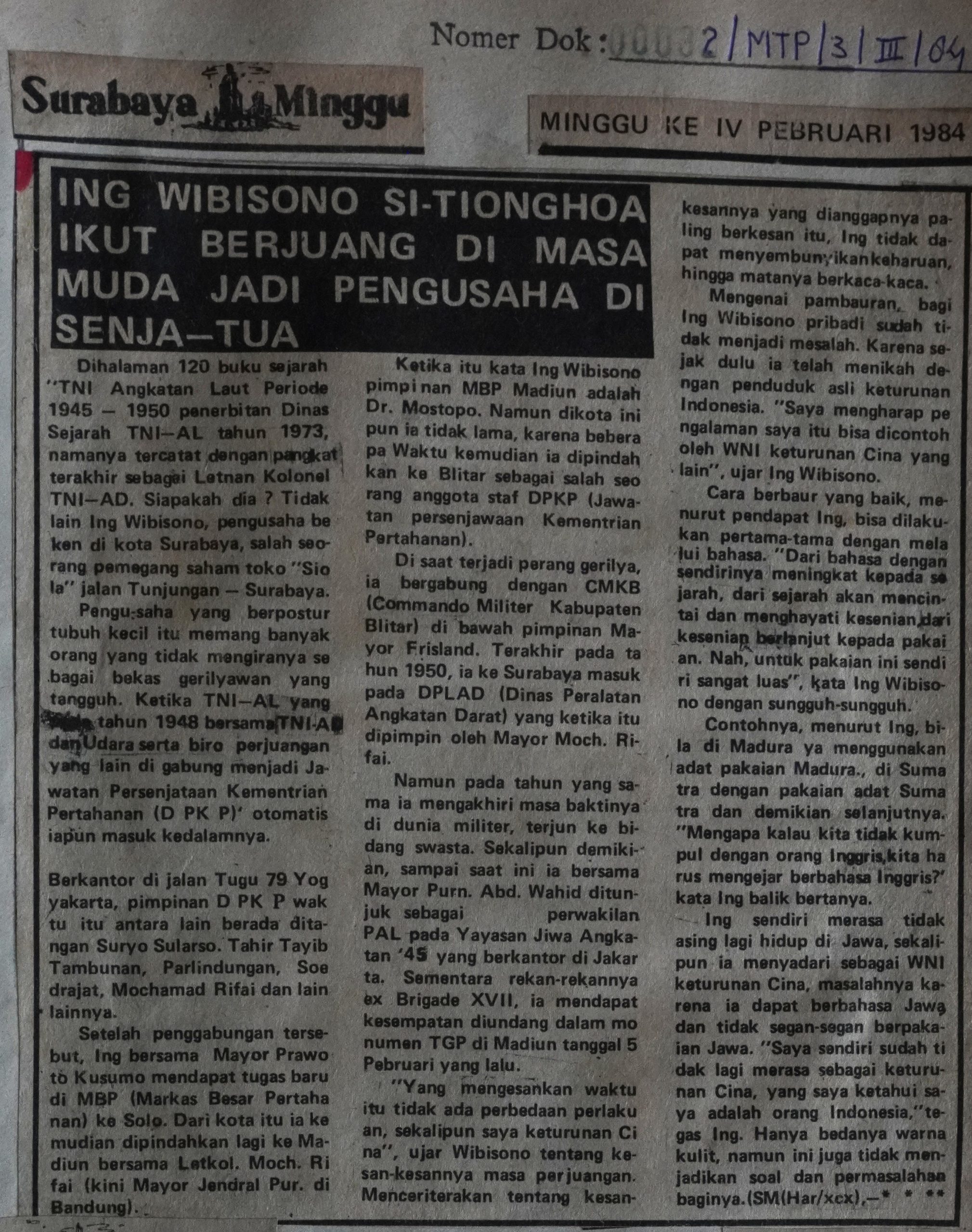 Pada halaman 120 buku sejarah TNI Angkatan Laut Periode 1945-1950 penerbitan Dinas Sejarah TNI-AL tahun 1973, nama Ing Wibisono tercatat dengan pangkat terakhir sebagai Letnan Kolonel TNI-AD. Dia juga seorang pengusaha dan salah seorang pemegang saham toko “Siola” jalan Tunjungan.