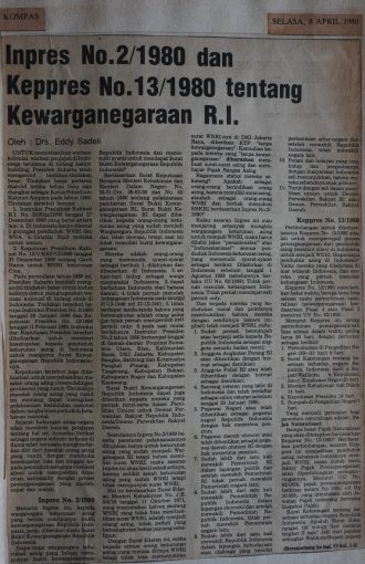 Pada awal tahun 1980, Presiden Suharto kembali mengambil tindakan besar, yaitu menghapus warisan kolonial di bidang etnik. Tindakan tersebut berupa Inpres No. 2/1980 tanggal 30 Januari 1980 dan Keppres No. 13/1980 tanggal 11 Februari 1980. Kedua peraturan tersebut dikeluarkan untuk memberi kesempatan kepada penduduk keturunan asing di Indonesia untuk mengurus Surat Kewarganegaraan Republik Indonesia-nya.