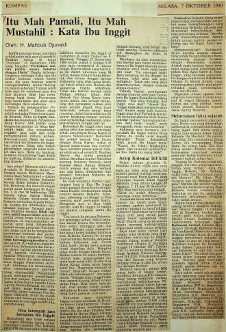 Menindaklanjuti artikel H. Rosihan Anwar di koran Kompas 15 September 1980 yang berjudul “Perbedaan Analisa Politik Antara Sukarno dengan Hatta”, penulis langsung menanyakan pokok-pokok tulisan tersebut kepada Bu Inggit yang dulu teratur menjeguk Bung Karno di penjara Sukamiskin.