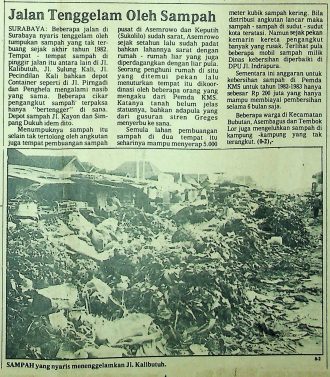 Beberapa jalan di Surabaya nyaris tenggelam oleh tumpukan sampah yang terbuang sejak akhir tahun 1982. Tempat sampah di pinggir Jl. Kalibutuh, Jl. Sulung Kali, Jl. Pecindilan Kali membludak dan beberapa cikar pengangkut sampah terpaksa hanya “bertengger” di sana.