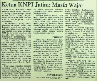 Kenaikan BBM menurut Ketua KNPI Jatim, drs. H. Rofiq Kusumodilogo, masih dalam batas yang wajar. Kenaikan itu tidak seberapa dan masih dijangkau oleh masyarakat. Ia mendukung keputusan ini selama untuk kebaikan pembangunan.