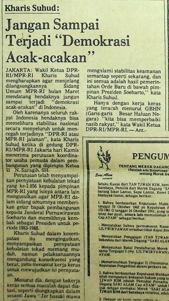 Wakil Ketua DPR-RI/MPR-Ri Kharis Suhud mengharapkan agar menjelang Sidang Umum MPR-RI bulan Maret 1983 hendaknya jangan sampai terjadi “demokrasi acak-acakan” di Indonesia.