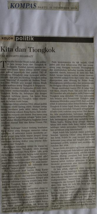 Hubungan bilateral Indonesia dengan Tiongkok makin dekat secara politis, ekonomi, dan budaya. Jika merujuk pada pengalaman 1965 sampai dibekukanya hubungan 1967, kita sebagai bangsa besar semestinya lebih matang, tak berlaku diskriminatif terhadap “orang Tionghoa” yang juga saudara-saudara kita sendiri.