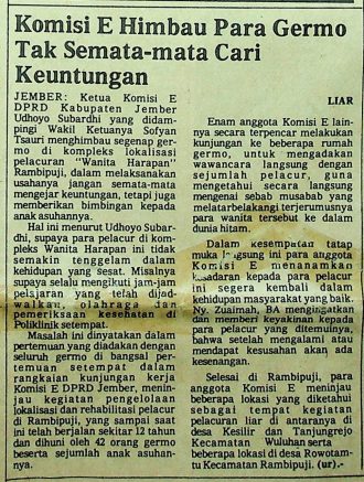 Ketua Komisi E DPRD Kabupaten Jember Udhoyo Subardhi yang didampingi Wakil Ketua Sofyan Tsauri menghimbau segenap germo di kompleks lokaliasai pelacuran “Wanita Harapan” Rambipuji dalam melaksanakan usahanya jangan semata-mata mengejar keuntungan, tetapi juga memebrikan bimbingan kepada anak asuhnya.