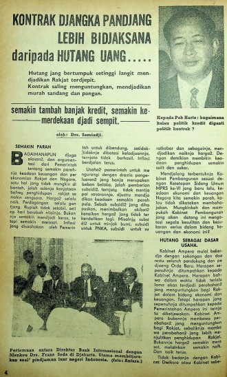 Dalam menghadapi perekonomian Indonesia yang memburuk, Pak Harto memutuskan untuk melakukan kontrak usaha agar saling menguntungkan dan menjadikan sandang dan pangan murah. Apabila Pak Harto memilih hutang sebagai dasar usaha maka hutang negara akan bertumpuk setinggi langit dan menjadikan rakyat terjepit. Semakin banyak kredit, semakin kemerdekaan menjadi sempit.