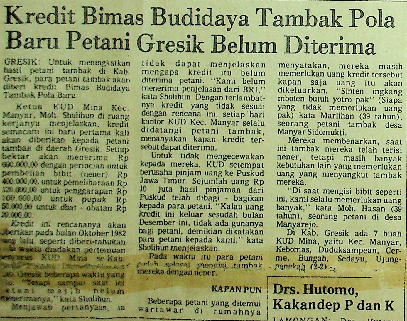 Demi meningkatkan hasil tambak di kab. Gresik, para petani tambak akan diberi kredit Bimas Budidaya Tambak Pola Baru.