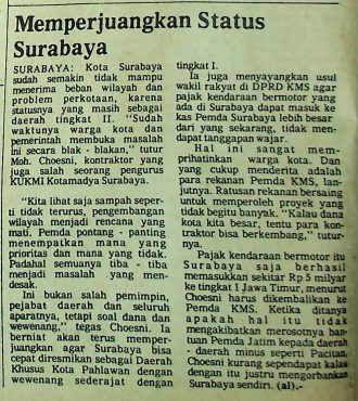 Kota Surabaya tidak mampu menerima beban wilayah dan problem perkotaan, karena statusnya yang masih sebagai daerah tingkat II, “Sudah waktunya warga kota dan pemerintah membuka masalah ini secara blak – blakan,” tutur Moh. Choesni, kontraktor yang juga salah seorang pengurus KUKMI Kotamadya Surabaya.