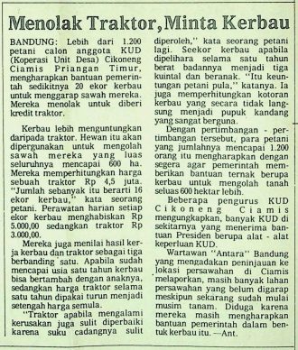 Lebih dari 1.200 petani calon anggota KUD (Koperasi Unit Desa) Cikoneng, Ciamis Priangan Timur, mengharapkan bantuan pemerintah sedikitnya 20 ekor kerbau untuk menggarap sawah dan mereka menolak untuk diberi kredit traktor