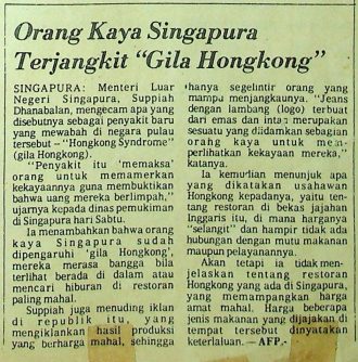 Menteri Luar Negeri Singapura, Suppiah Dhanabalan, mengecam apa yang disebutnya sebagai penyakit baru yang mewabah di Singapura yaitu gilang Hongkong atau Hongkong Syndrome. Penyakit ini datang dari kebiasaan pengusaha dan orang kaya di Hongkong yang biasa mamerkan kekayaannya dan mencari hiburan di restoran mahal, kebiasaan ini mulai dilakukan oleh orang Singapura.