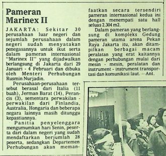 Sekitar 30 perusahaan luar negeri dan sejumlah perusahaan dalam negeri sudah menyatakan untuk ikut serta dalam pameran internasional “Marinex II” yang dijadwalkan berlangsung di Jakarta dari 29 Januari 1983 sampai 4 Februari 1983, acara ini dibuka langsung oleh Menetri Perhubungan Rusmin Nurjadin