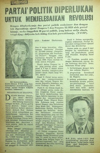 Partai-partai politik harus mendukung pelaksanaan revolusi sehingga partai yang tidak mendukung harus dibubarkan sesuai dengan Penpres no. 7. Partai yang dibubarkan adalah PSI dan Masjumi karena memberontak PRRI dan Permesta serta menghianati revolusi, maka jumlah partai di Indonesia tinggal 10 partai yang memenuhi syarat dalam menyelesaikan revolusi, yakni PNI, NU, PKI, Partai Katholiek, Parkindo, Partai Murba, PSII, IPKI, Partindo, dan Partai Islam Perti.