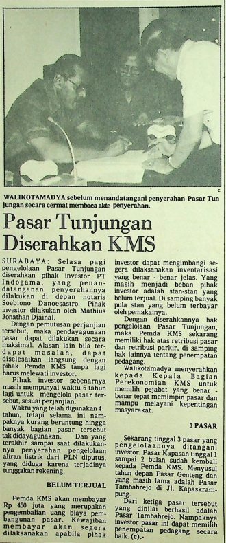 Pengelolaan Pasar Tunjungan diserahkan pihak investor PT Indogama di depan notaris Soebiono Danoesastro, dimana pihak investor dilakuakan oleh Mathius Jonathan Djainal, tujuan penyerahan ini agar pengelolaan pasar Tunjungan bisa menjadi lebih maksimal