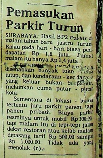 Pemasukan dari parkir kendaraan di malam tahun baru justru menurun. Jika pada hari-hari biasa pendapatan mencapai 1,6 juta, Jumat malam pendapatan hanya mencapai sekitar 1,4 juta. Turunnya pendapatan parkir ini disebabkan banyaknya toko yang tutup dan kendaraan yang keluar bukan untuk parkir, melainkan hanya untuk berkeliling kota.