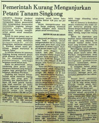Direktur Jendral Tanaman Pangan Ir. Wardoyo, menegaskan bahwa pemerintah tidak menginginkan masyrakat menajadikan singkong sebagai makana utama, sehingga pemerintah kurang menganjurkan petani untuk menanam singkong