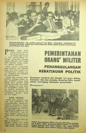 Di bawah pimpinan The Smilling General, Pak Harto, dimulailah rehabilitasi kehancuran ekonomi, politik, dan sosial Indonesia akibat ambisi pribadi dan golongan pada masa pemerintahan orde lama. Banyak negara lain melakukan hal yang sama, di mana tokoh militer lah yang memegang kekuasaan. Sebagai contoh lain Republik Persatuan Arab yang menjadi kuat karena berada di bawah pimpinan Kolonel Gamal Abdul Nasser.