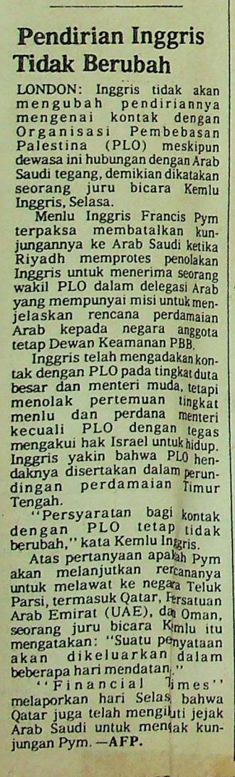 Inggris tidak akan mengubah pendiriannya mengenai kontak dengan Organisasi Pembebasan Palestina (PLO)