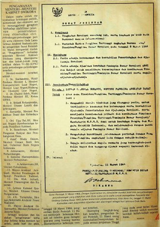 Dalam usaha untuk menyehatkan kehidupan politik, pemerintah, dan ekonomi, Letnan Jenderal Soeharto selaku pengemban Supersemar mengambil tindakan “pengamanan” terhadap sejumlah Menteri Kabinet Dwikora dan tokoh-tokoh yang terlibat dalam G30S/PKI.
