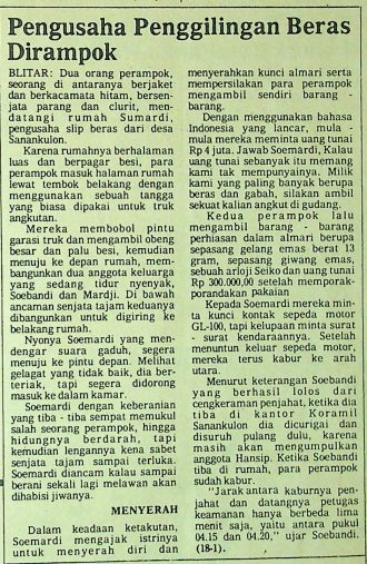Rumah Sumardi, seorang pengusaha slip beras dari desa Sanankulon, Blitar didatangi dua perampok, seorang diantaranya berjaket dan berkacamata hitam, bersenjata parang dan clurit.