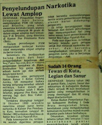 Pengadilan Negeri Depasar melakukan sidang terhadap FSM (25), turis asal Brasilia yang telah menerima kiriman cocain sejenis narkotika sebanyak 80 gram di dalam amplop dari temanya P yang juga berasal dari Brasilia. Amplop berisi narkoba ini diterima di Kantor Pos Pembantu Kuta (Bali).