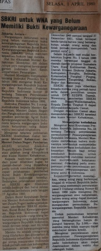 Menteri Kehakiman, Moedjono SH mengugumkan bahwa warga negara keturunan asing yang belum mempunyai bukti kewarganegaraan Republik Indonesia perlu diberikan Surat Bukti Kewarganegaraan Republik Indonesia (SBKRI) untuk memberi kepastian hukum bagi mereka.