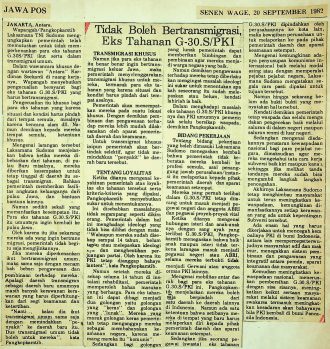 Wapangab/Pangkopkamtib Laksamana TNI Sudomo mengungkapkan pemerintah telah memutuskan untuk tidak memperkenakan para eks tahanan G30S/PKI ikut serta dalam transmigrasi umum.