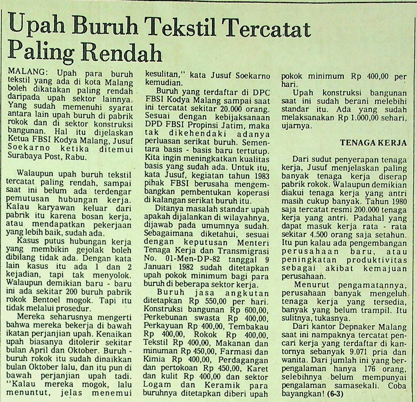 Upah para buruh tekstil di Malang dinilai paling rendah jika dibandingkan dengan upah sektor lainnya seperti buruh pabrik rokok dan sektor kontruksi bangunan.